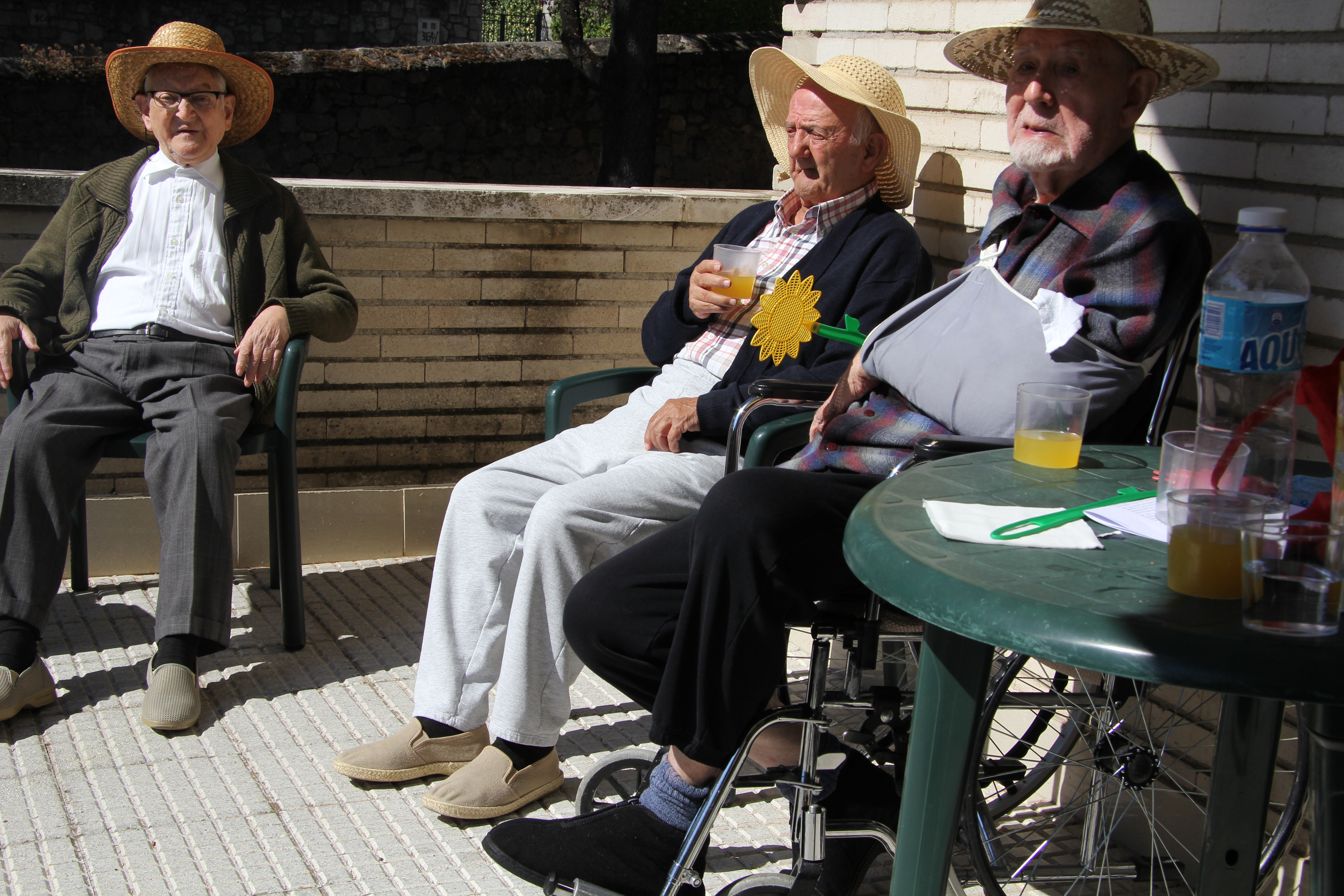 Cuando han llegado ya las 7 u 8 sillas matriculadas y aptas al tráfico se abre la bolsa del convivio. Refrescos, jugo, néctar, esencia, cualquier sommelier calificaría de toronja, chironja –híbrido de naranja y toronja-, pomelo, piña … Vamos, como el maná con todos los sabores. Todo sale de la misma jarra y a cada uno le sabe según su ánimo y voluntad. ¿No hemos visto esas máquinas de refrescos de Fried Chicken y otras grandes superficies (¡menudo palabro inventamos!) que surten la Coca, la Pepsi, el Iced Tea, … y todo viene de un mismo tubo conductor (conectado a la espalda de la máquina) que luego se sirven por las distintos grifos? En un ambiente como éste, de la Residencia, sabemos que es simplemente un placebo para buenas personas. ¡Hoy se han vuelto a olvidar de los boquerones, los tacos de jamón y las olivas!