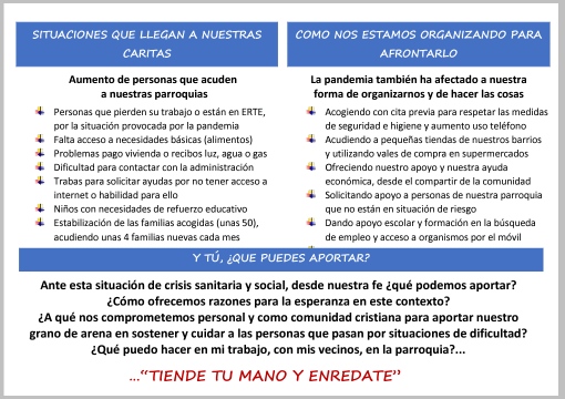 Debemos reflexionar y pensar que, ante esta situación de crisis sanitaria y social, desde nuestra fe, ¿qué podemos aportar? ¿Cómo ofrecemos razones para la esperanza en este contexto? ¿A qué nos comprometemos personalmente y como comunidad cristiana para aportar nuestro grano de arena en sostener y cuidar a las personas que pasan por situaciones de dificultad? ¿Qué puedo hacer en mi trabajo, con mis vecinos, en la parroquia?
