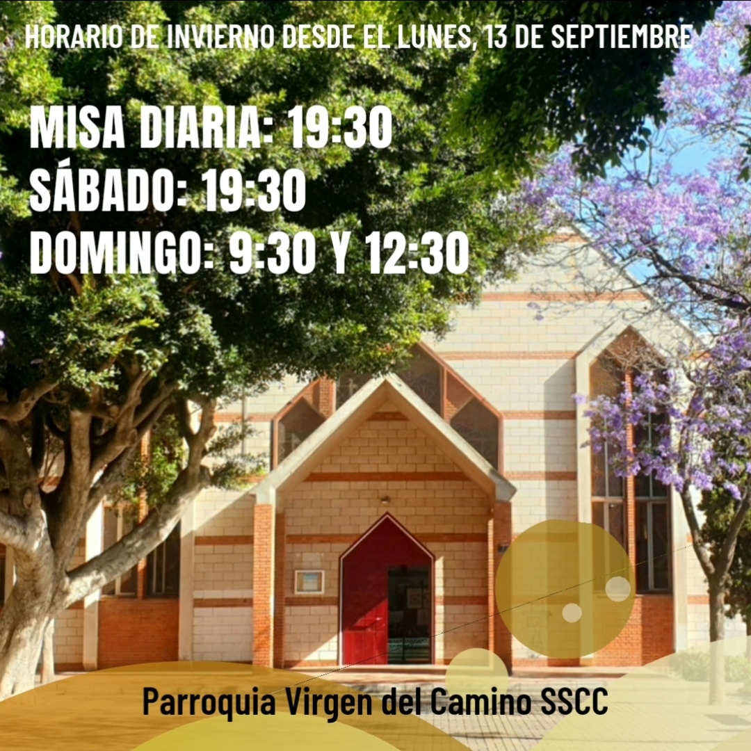 Desde este lunes, 13 de septiembre, retomamos el horario de invierno. Las eucaristías diarias se celebrarán a las 19: 30 y las de los fines de semana, de momento, seguirán siendo el sábado a las 19:30 y el domingo a las 9:30 y 12:30.