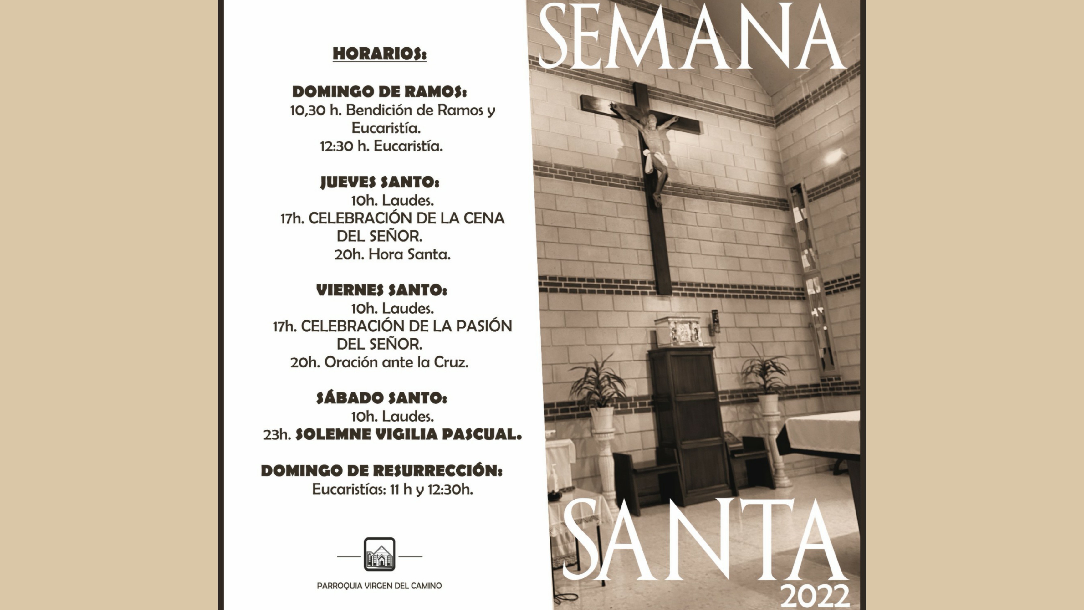 Semana Santa 2022 Publicado el 11/04/202217/04/2022 por Virgen del Camino SSCC Vigilia Pascual Viernes Santo Jueves Santo Domingo de Ramos Programa y horarios Semana Santa 2022 Todas las imágenes y actividades de Cuaresma, pinchando en la imagen Para compartir Haz clic para compartir en WhatsApp (Se abre en una ventana nueva) WhatsApp Haz clic para compartir en X (Se abre en una ventana nueva) X Haz clic para compartir en Facebook (Se abre en una ventana nueva) Facebook Haz clic para compartir en Telegram (Se abre en una ventana nueva) Telegram Haz clic para compartir en Pinterest (Se abre en una ventana nueva) Pinterest Haz clic para enviar un enlace por correo electrónico a un amigo (Se abre en una ventana nueva) Correo electrónico Haz clic para imprimir (Se abre en una ventana nueva) Imprimir Relacionado