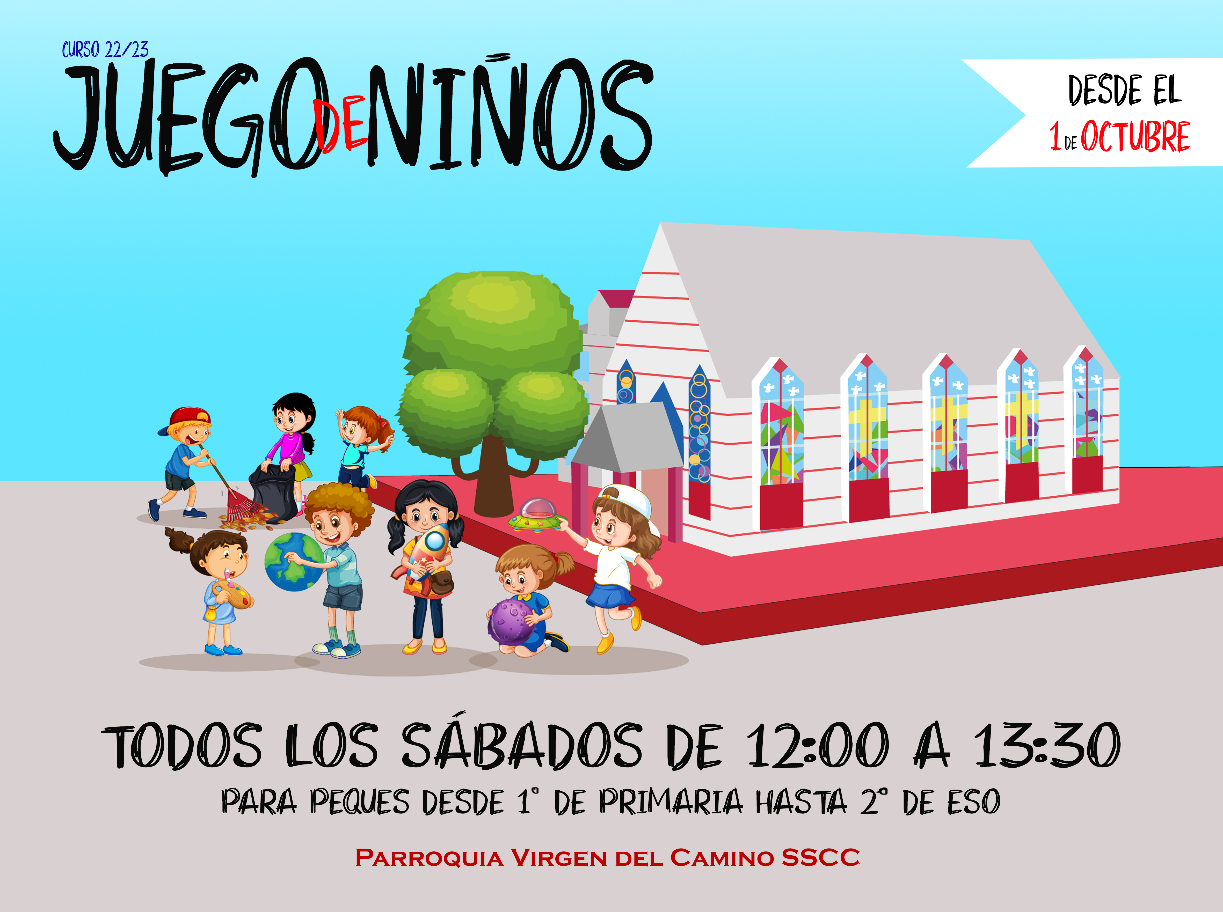 Ya tenemos fecha para la vuelta de «Juego de Niños»: desde el 1 de octubre, todos los sábados de 12:00 a 13:30, los jóvenes de la parroquia organizarán actividades muy divertidas en la plaza de la iglesia. Están dirigidas a peques desde primer curso de Primaria hasta segundo de ESO.