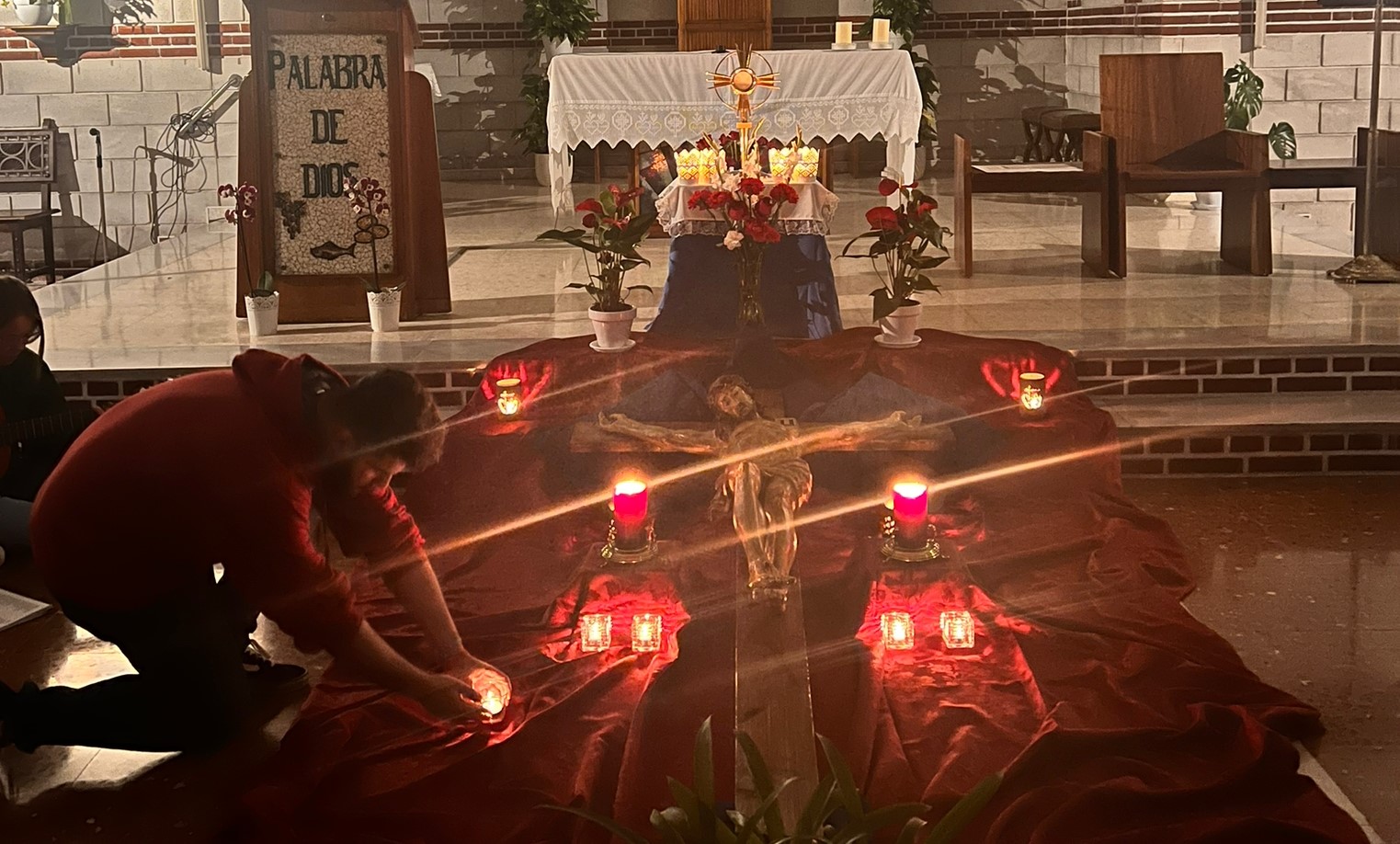Un grupo de jóvenes de la comunidad de Virgen del Camino ha celebrado este domingo una adoración como despedida a la cruz de la Jornada Mundial de la Juventud, que durante tres semanas ha permanecido en la parroquia, dentro del itinerario que la está llevando en estos meses por las iglesias del arciprestazgo de San Patricio.