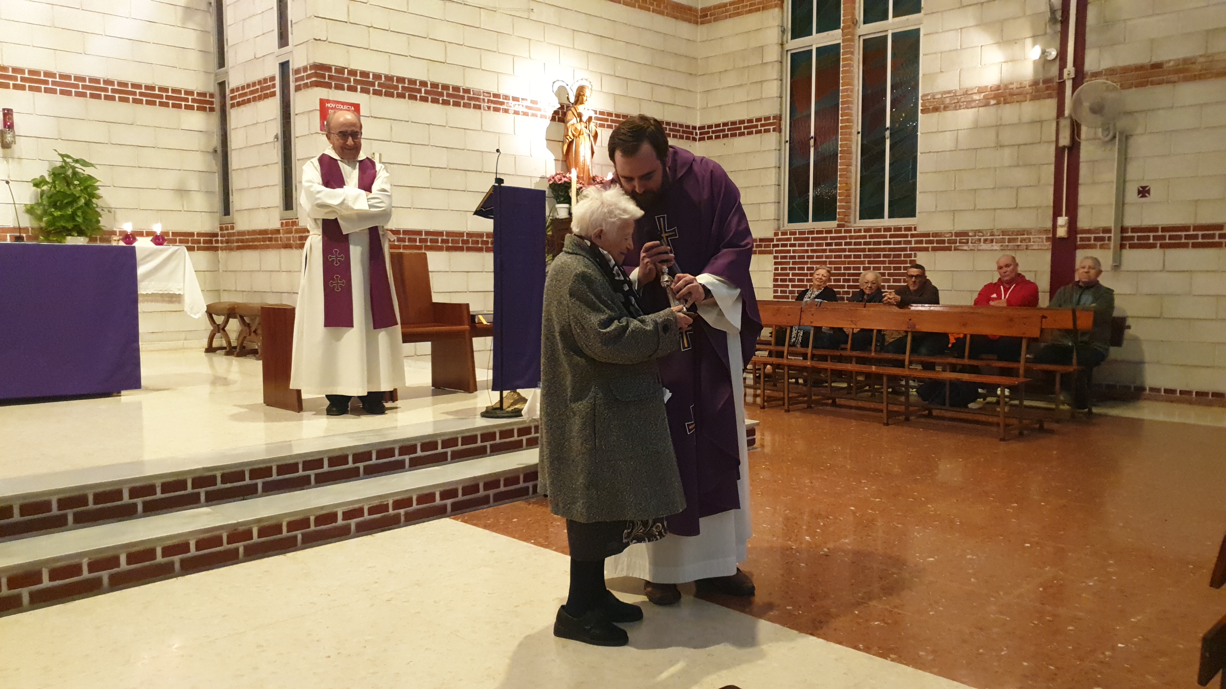 Y, hablando de servir, el acto del Envío terminó con un sencillo -y divertido- homenaje a alguien que lo ha hecho incansablemente durante medio siglo: Purita, nuestra Purita, quien, según recordó el padre Pablo, «aún no estaba construida nuestra actual iglesia y ya estaba ejerciendo en la que había entonces». 50 años sin tener vacaciones, recordaba la propia Purita, quien recibió como recuerdo una figura del padre Damián, de quien es tan devota. Aunque ya no ejercerá como sacristana, Purita seguirá viniendo a la parroquia y siendo corazón de la misma, ahora con otras funciones «como rezar por nosotros», concluyó el padre Pablo.